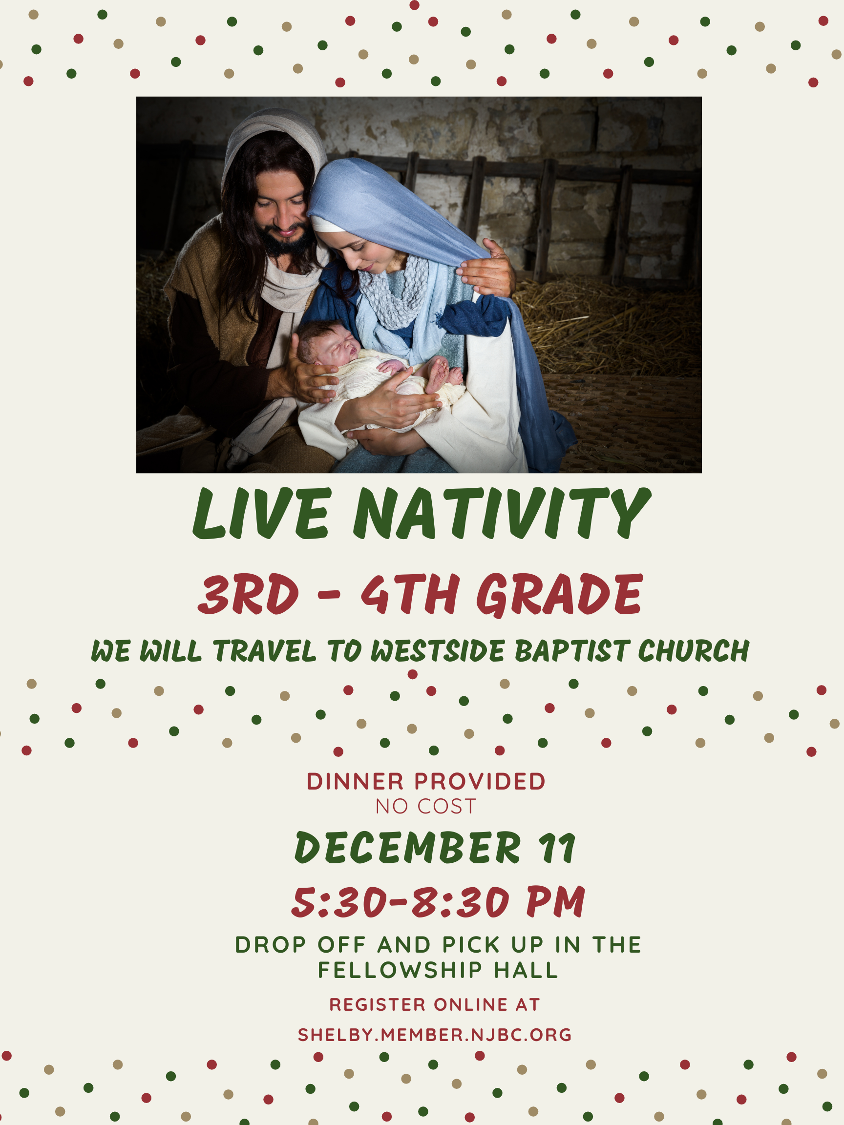 WE WILL BE TRAVELING BY VAN TO WESTSIDE BAPTIST CHURCH FOR THE LIVE NATIVITY.